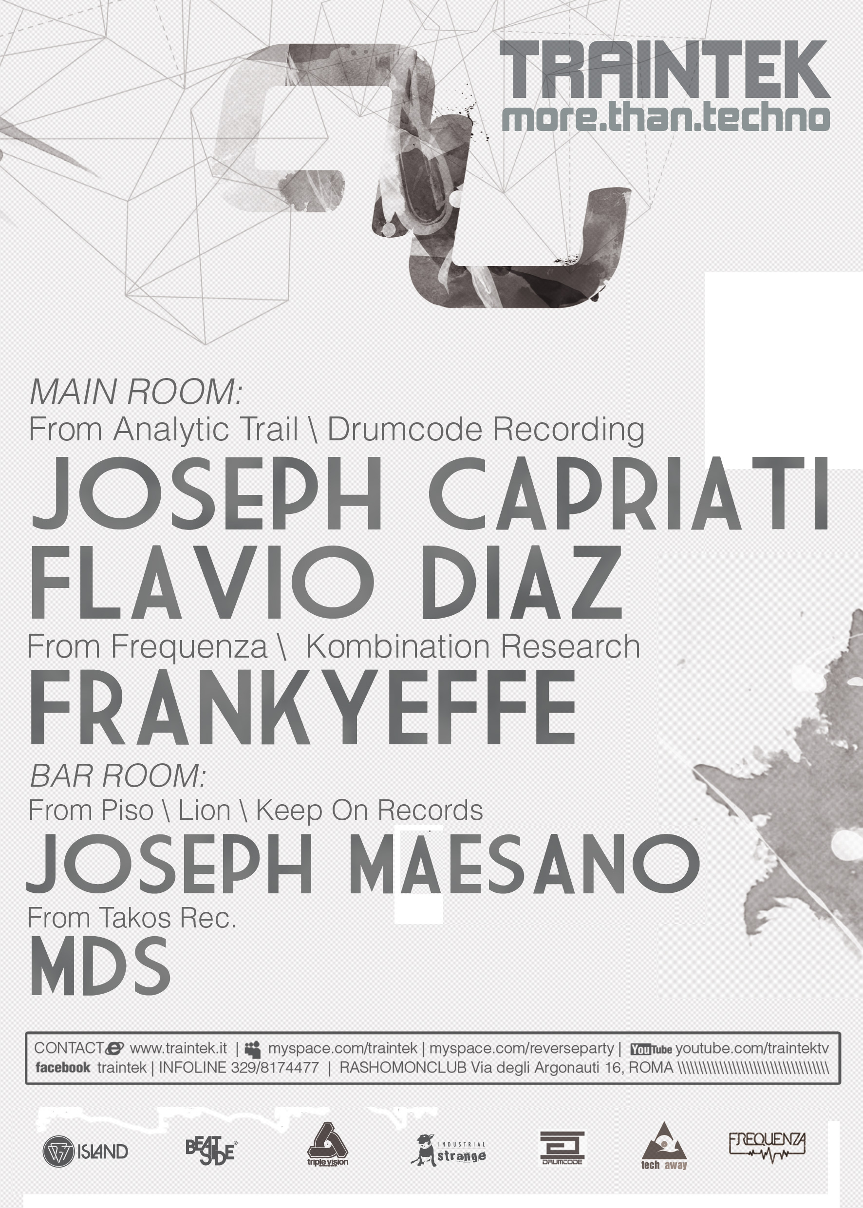 -COMUNICATO STAMPA- TRAINTEK MORE.THAN.TECHNO presents THE GREAT OPENING PARTY featuring JOSEPH CAPRIATI FLAVIO DIAZ FRANKYEFFE Venerdì 15 ottobre 2010 Stagione numero tre per Traintek, l’unico vero evento techno della capitale. Anche quest’anno nella cornice underground del Rashomon Club, musica techno ed elettronica faranno di Traintek uno degli eventi più originali della notte romana. Ad onorare il party di apertura ci saranno Joseph Capriati e Flavio Diaz, giovani e talentuosi artisti appartenenti alla nuova scena underground indipendente partenopea. JOSEPH CAPRIATI Save my soul/ World Tour – Dj e producer,figura centrale della scena elettronica napoletana, dopo aver conquistato fama e prestigio in Italia, si è affacciato prepotentemente nel panorama internazionale con produzioni techno-minimal divenute poi grandi successi: Mikrobiotic, C’est la vie, Orange, Molotov, suonate da artisti come Richie Hawtin, Magda e Paco Osuna hanno fatto in fretta il giro del mondo. Dal 2007 collabora con label di successo come Analytic Trail di Markantonio e dal 2010 con CLR di Chris Liebing e Drumcode di Adam Beyer. I migliori club e festival di tutta Europa, Giappone, Stati Uniti e Sud America lo hanno visto protagonista nonostante la sua giovane età e Joseph continua a ridefinire la sua identità attraverso le più varie ed innovative sfumature del sound techno. https://www.youtube.com/watch?v=gihcV3b_aJo&feature=player_embedded https://www.youtube.com/watch?v=qdUp8Hc_DQg&feature=player_embedded https://www.youtube.com/watch?v=F2oq03xiToc&feature=player_embedded FLAVIO DIAZ- Proveniente del panorama underground napoletano, frequenta a Londra il City of Westminster College e la London School of sound divenendo uno degli artisti di punta dell'etichetta Analytic Trail di Markantonio. Dopo aver collaborato con Rino Cerrone alla realizzazione di Campi flegrei, ep contenente Miseno, passata tra le mani dei massimi nomi della scena elettronica internazionale, nel 2009 esce One last cigarette che arriva fino alla consolle di Carl Cox. Conferma il proprio successo all’inizio del 2010 debuttando con la Drumcode del fondatore della techno Adam Beyer. Club internazionali, festival, prestigiose etichette discografiche: la sua firma nel mondo della musica elettronica conquista ogni giorno maggior successo. https://www.myspace.com/djflaviodiaz